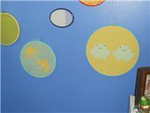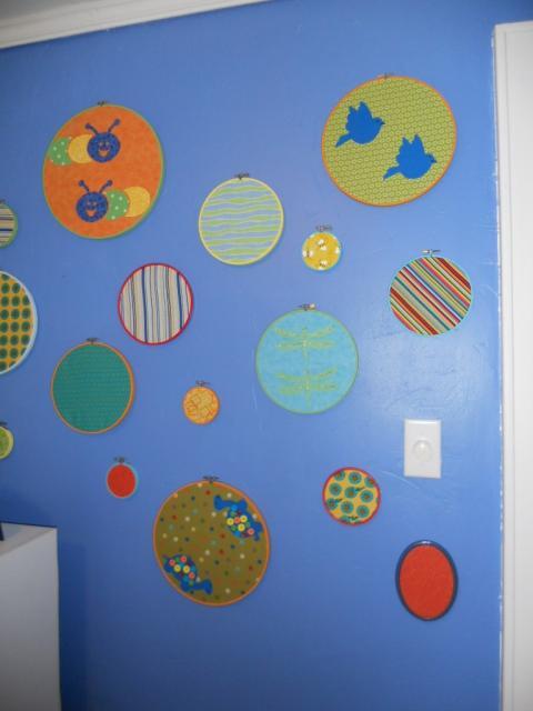 Lindsey Kaptur, June 2011, collected embriodery hoops from rummage sales & thrift stores, painted them, used about 12 different fabrics to cover them. Then affixed the animals with fabric glue & added eyes, bubbles to the octopus & stripes to the bees -