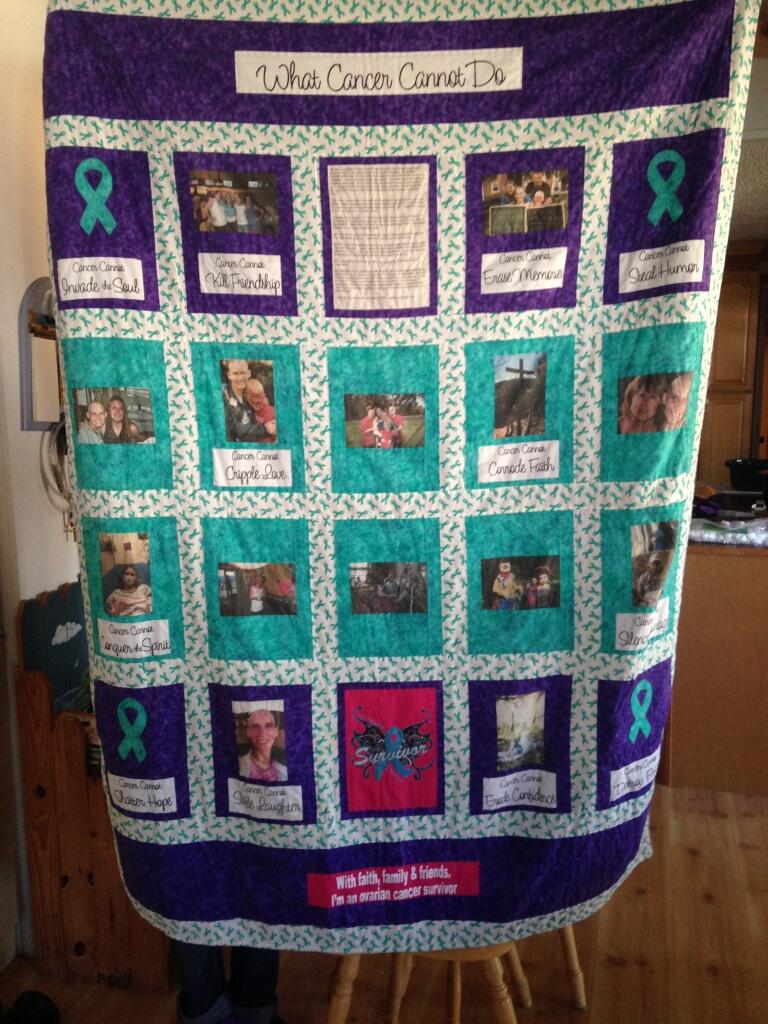 2016 - jan. Linda made this awesome awareness quilt with some of the ovarian cancer ribbons expressing "What Cancer Cannot Do". Totally awesome -
